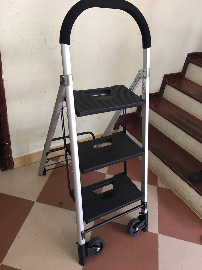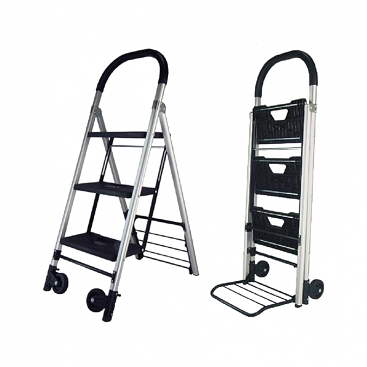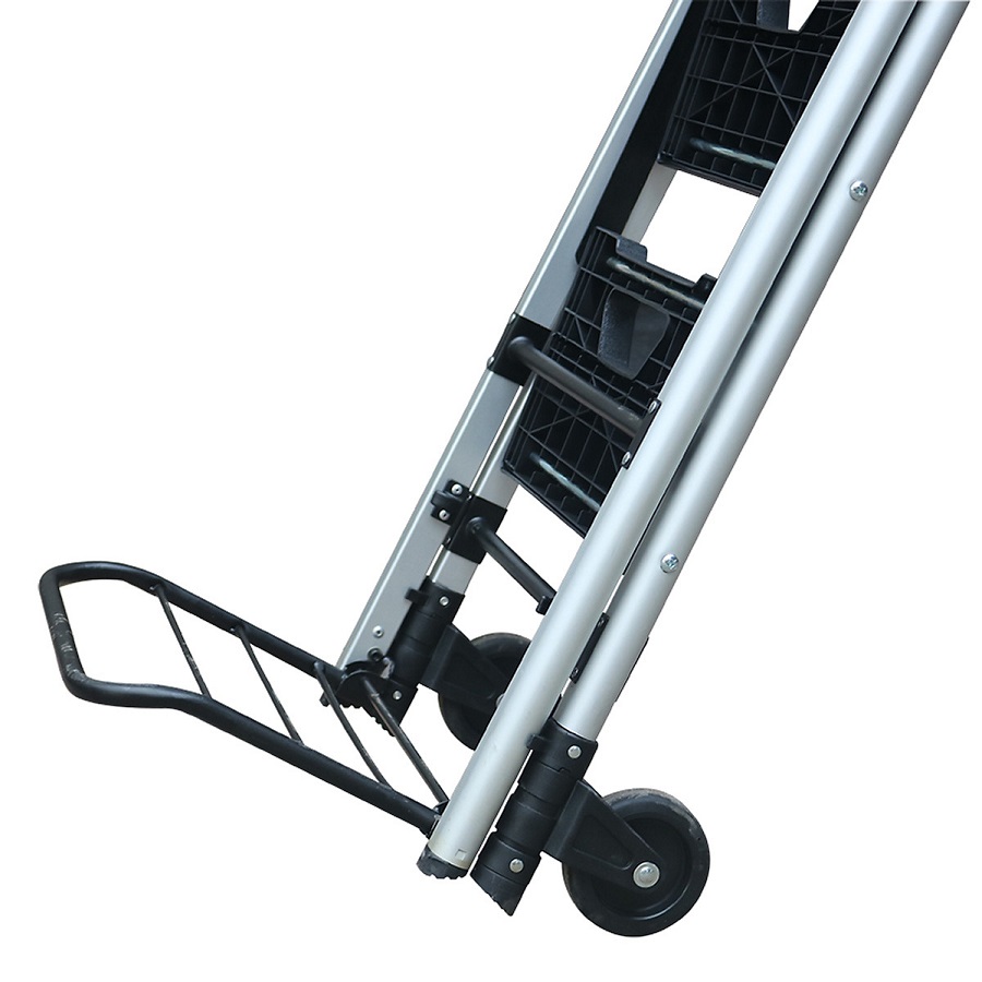 Với chức năng xe đẩy hàng. Bạn chỉ cần gấp gọn thang và kéo phần mặt sàn xe đẩy ra là có thể sử dụng được ở dạng xe đẩy hàng. Phần tay cầm của thang cũng biến thành phần tay kéo cho xe đẩy hàng. Khi cần di chuyển hàng hóa bạn sẽ đặt hàng hóa lên mặt sàn và di chuyển như những chiếc xe đẩy hàng thông thường với tải trọng xe đẩy là 60kg. Bánh xe được làm từ nhựa PP bền chắc chắn giúp xe đẩy có thể di chuyển êm ái. Phù hợp sử dụng cho gia đình.